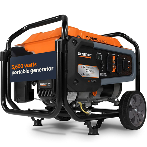 The 3600-watt Generac GP3600 portable generator can be used to tackle home projects, provide power for tools, or deliver essential electricity in the case of an outage. It is an especially affordable solution with premium features. These include PowerRush™ Advanced Technology — delivering over 40% more starting capacity* —an OHV engine for longer engine life and a large-capacity steel fuel tank with an incorporated fuel gauge for durability. The hardened steel tube cradle provides added strength, while the low-oil level shutdown protects your engine from damage. Heavy-duty, never-flat wheels and a foldable handle make for easy transportation of the generator. The compact size of the GP3600 ensures it will take up minimal storage space in the garage.